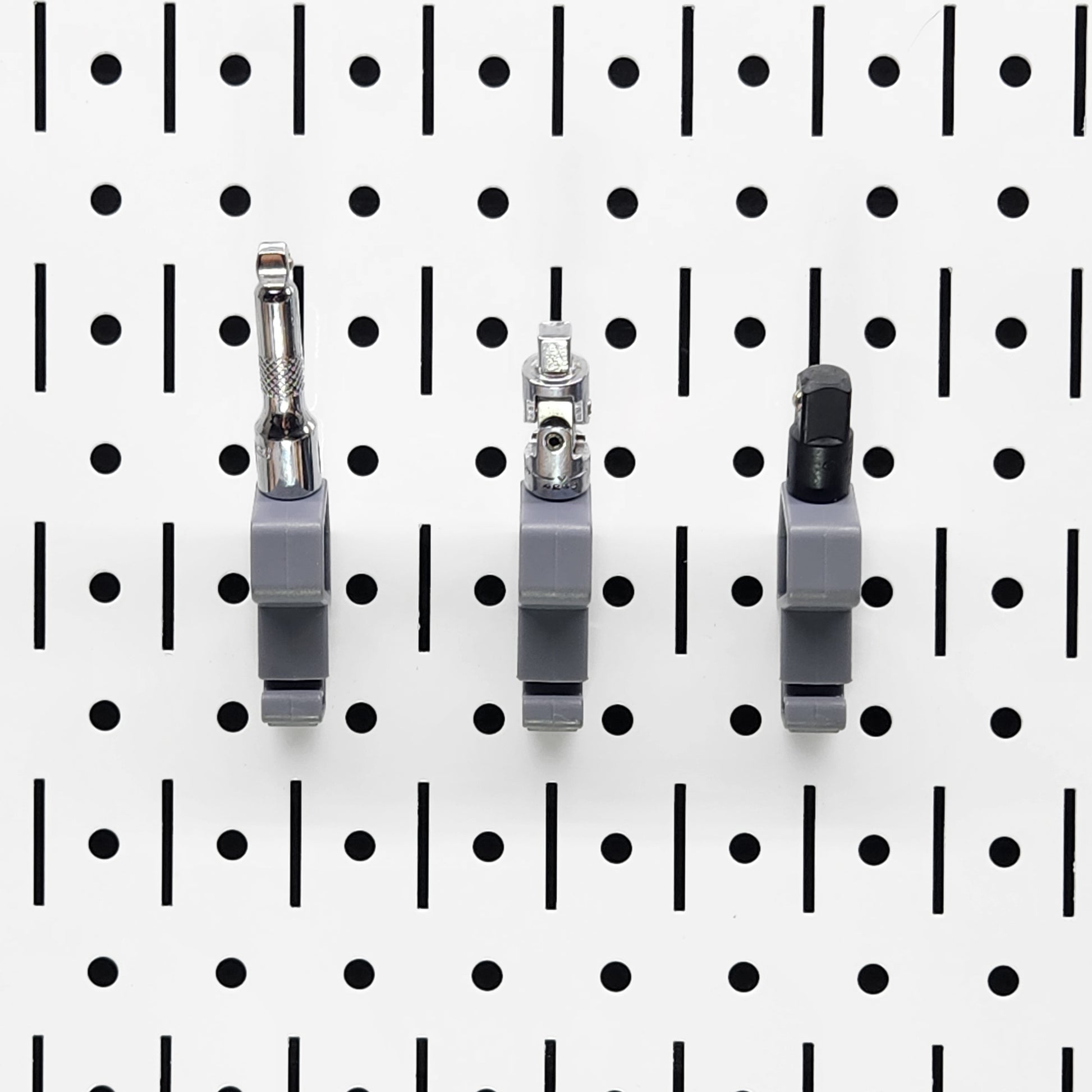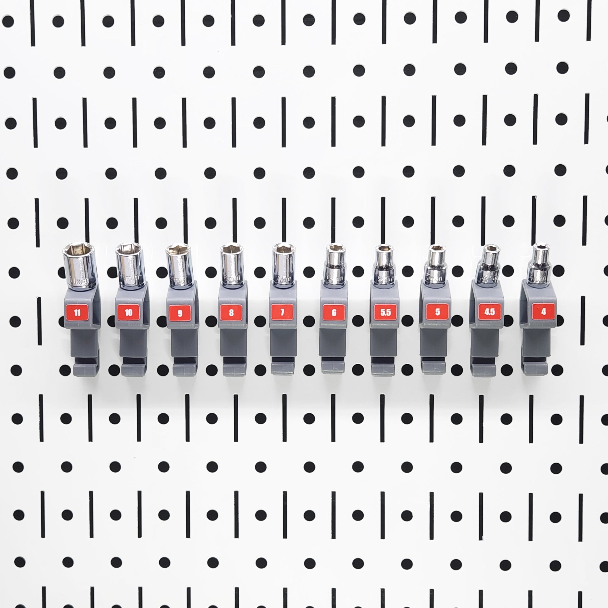 VERSATILE - Bracket for holding a single 1/4" drive socket, adapter, or extension. Each bracket has a flat face onto which a size identification decal can be placed. Size identification decals are included with purchase.