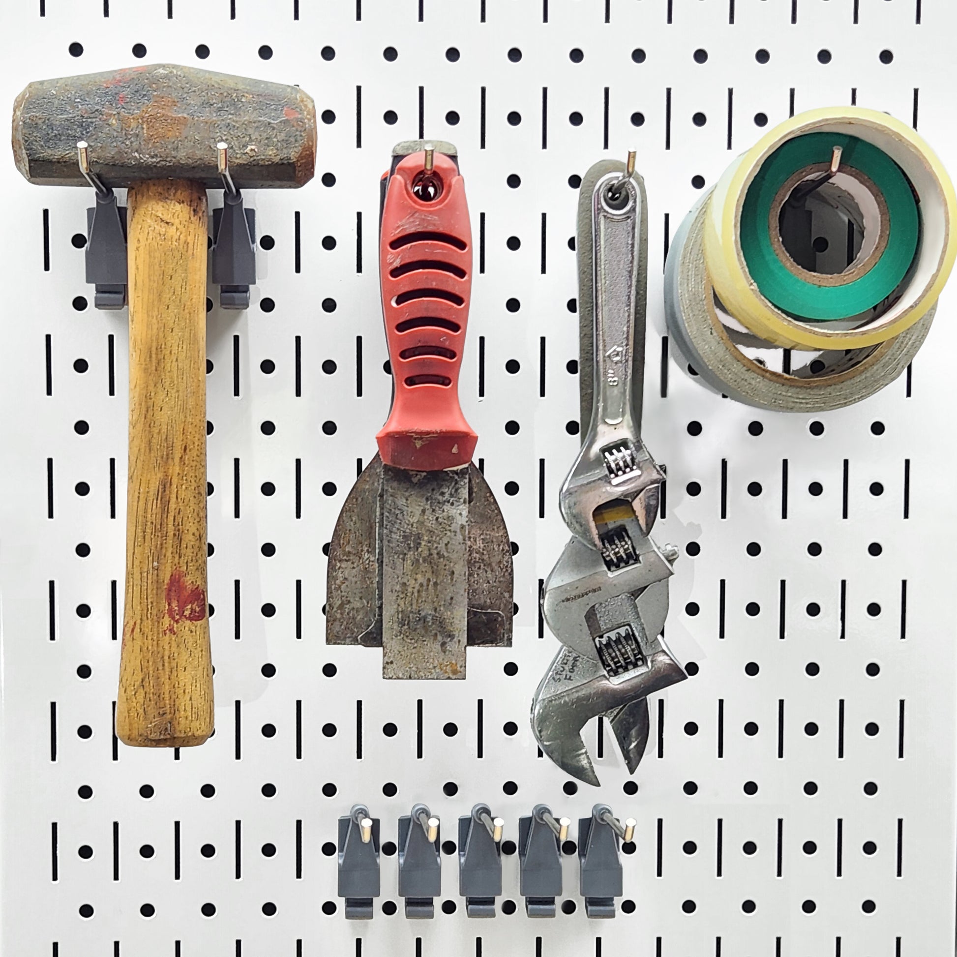 VERSATILE - Bracket for holding merchandise, wrenches, paint brushes, putty knives, hammers, mallets, tape rolls, wire spools, garden tools, and more.